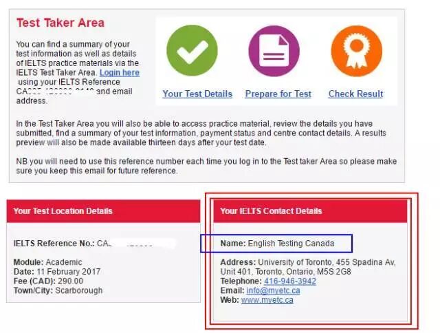 确认考试中心的方法很简单,只需找到你报考雅思考试后的确认邮件。在British Council的确认邮件里面,“Your IELTS Contact Details”这块儿,会写明你的考场隶属于哪个考试中心。比如这样的,那么蓝色框框里的就是你的考试中心。