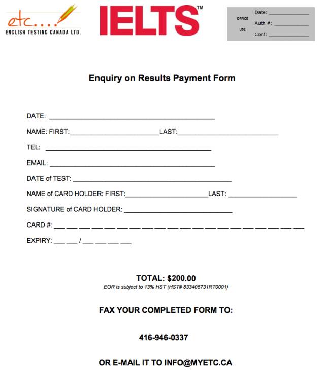 你需要将EOR申请表和原始的雅思考试成绩单交到考试中心。之后,你可以在考试中心支付复议的费用。Humber的考试中心接受信用卡、借记卡、Certified Cheque或者电汇。但是他们不接受个人支票和现金。