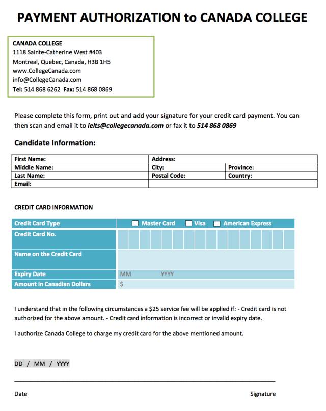 提交信用卡缴费授权表格可以通过传真(514-868-0869)或是以电邮(ielts@collegecanada.com)的方式提交。