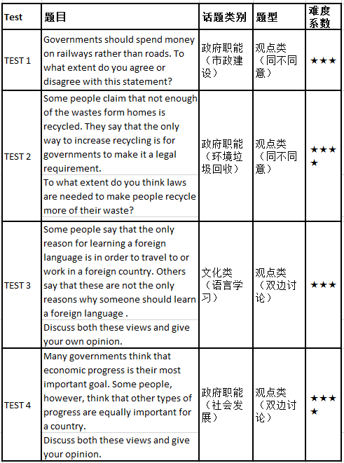从4个大作文的题目来看,一直延续的雅思考试最近几年的重点部分:观点类题型的相应考察,无论是一种观点的同不同意还是双边观点的各自讨论,在剑桥雅思11中都得到了体现(2:2),但是从其出题的整个题目语言结构跟之前剑桥4-7相比,更符合现在考试的整体出题规律,比如rather than/ the only way/ the most important 等等这词汇,这是近几年雅思考试出题的语言趋势。
