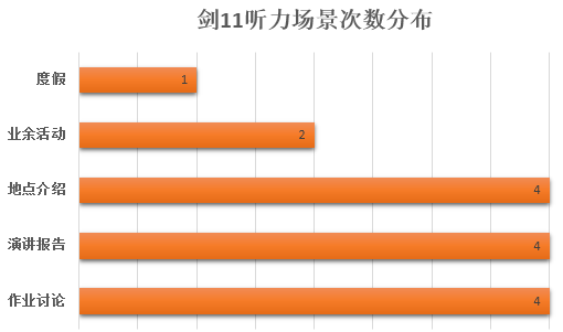 剑11四套听力真题中场景的分布还是比较有规律的。